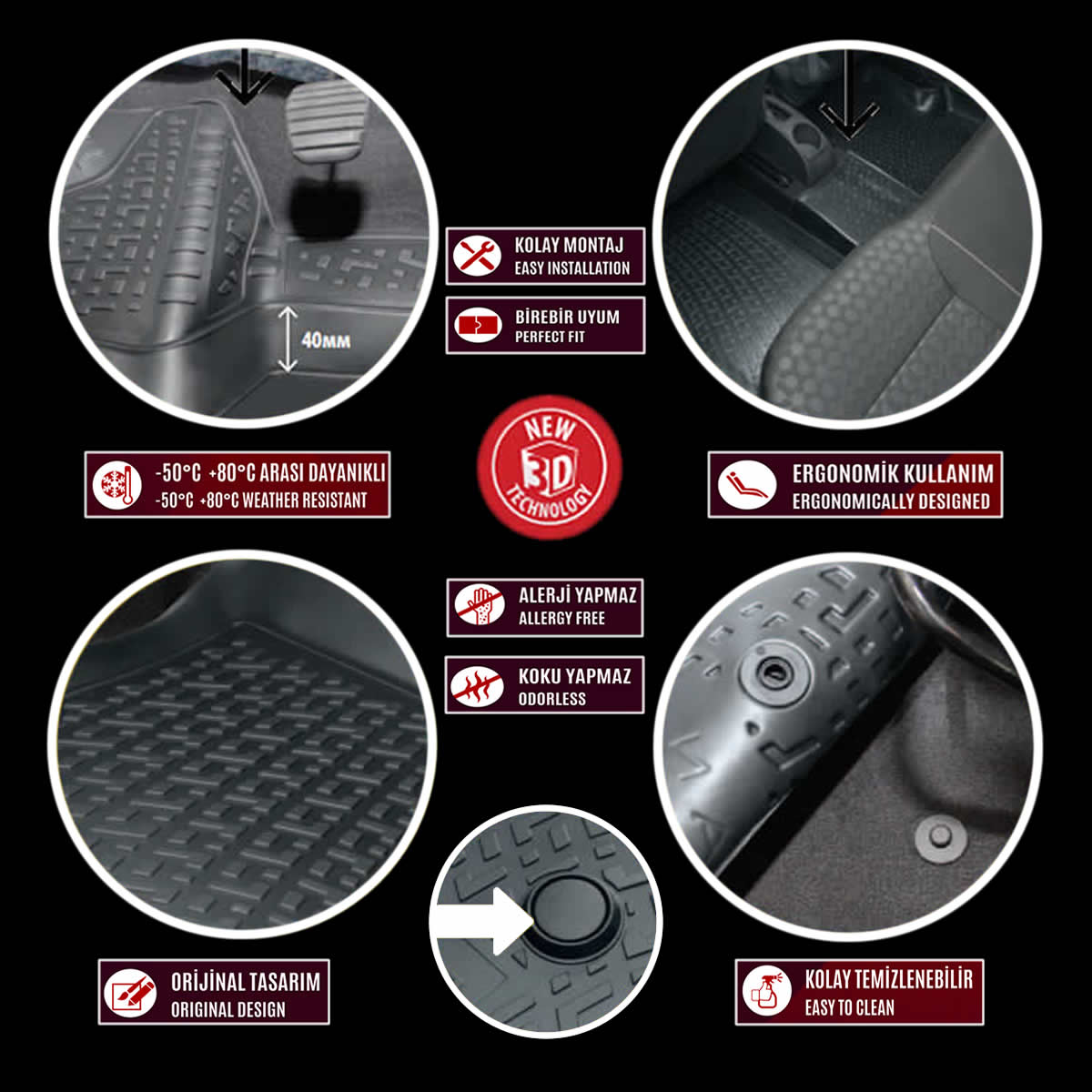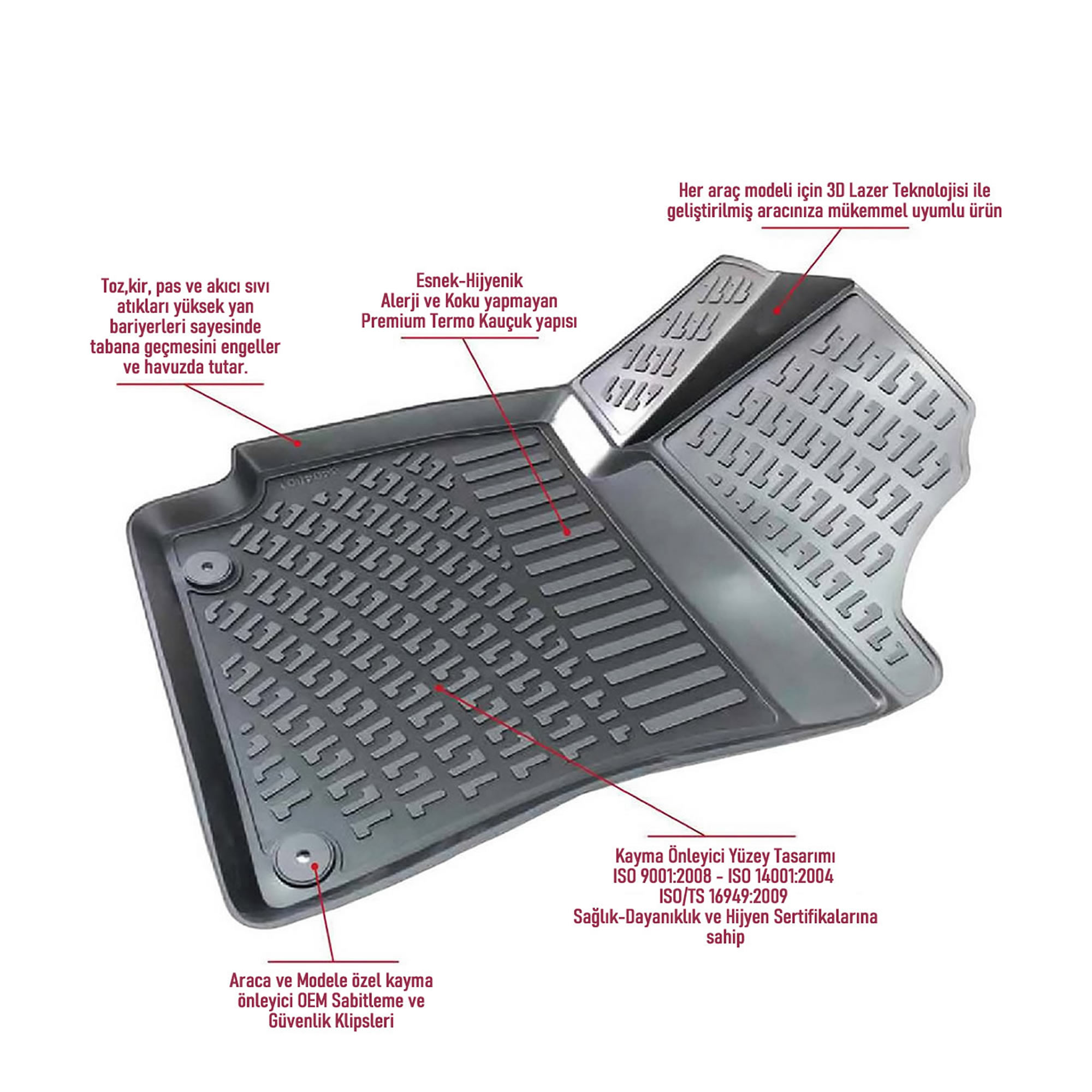 • Alerji ve Koku yapmayan, -50 ve +80 sıcaklıklığa dayanabilen TPE anti alerji ve hijyenik termo kauçuk materyal ile 1000 farklı araç modeline her araç modeline ayrı ayrı 3D Lazerleme teknolojisi ile geliştirilen ve üretilen kış şartları için mükemmel ürünlerdir.
